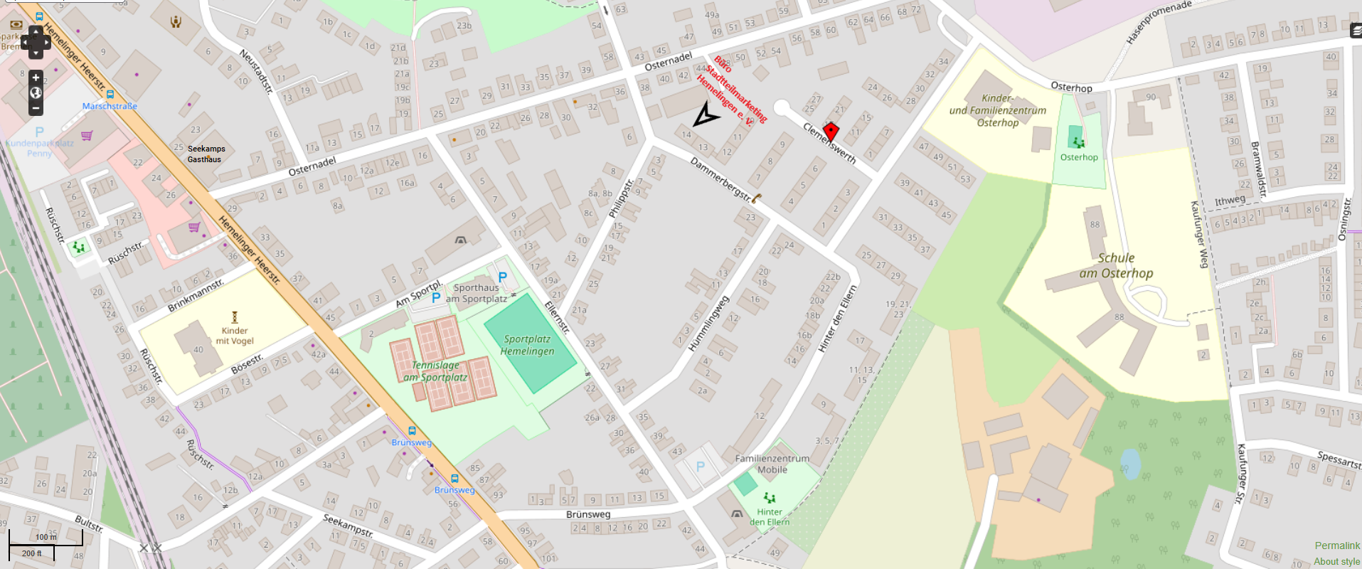 Auf der Hemelinger Heerstraße nach Nordwesten (an den Sportplätzen entlang), in die Straße Am Sportplatz einbiegen, am Ende rechts in die Ellernstraße, dann gleich links in die Philippstraße, am Ende der Philippstraße ist Dammerbergstraße 14.
